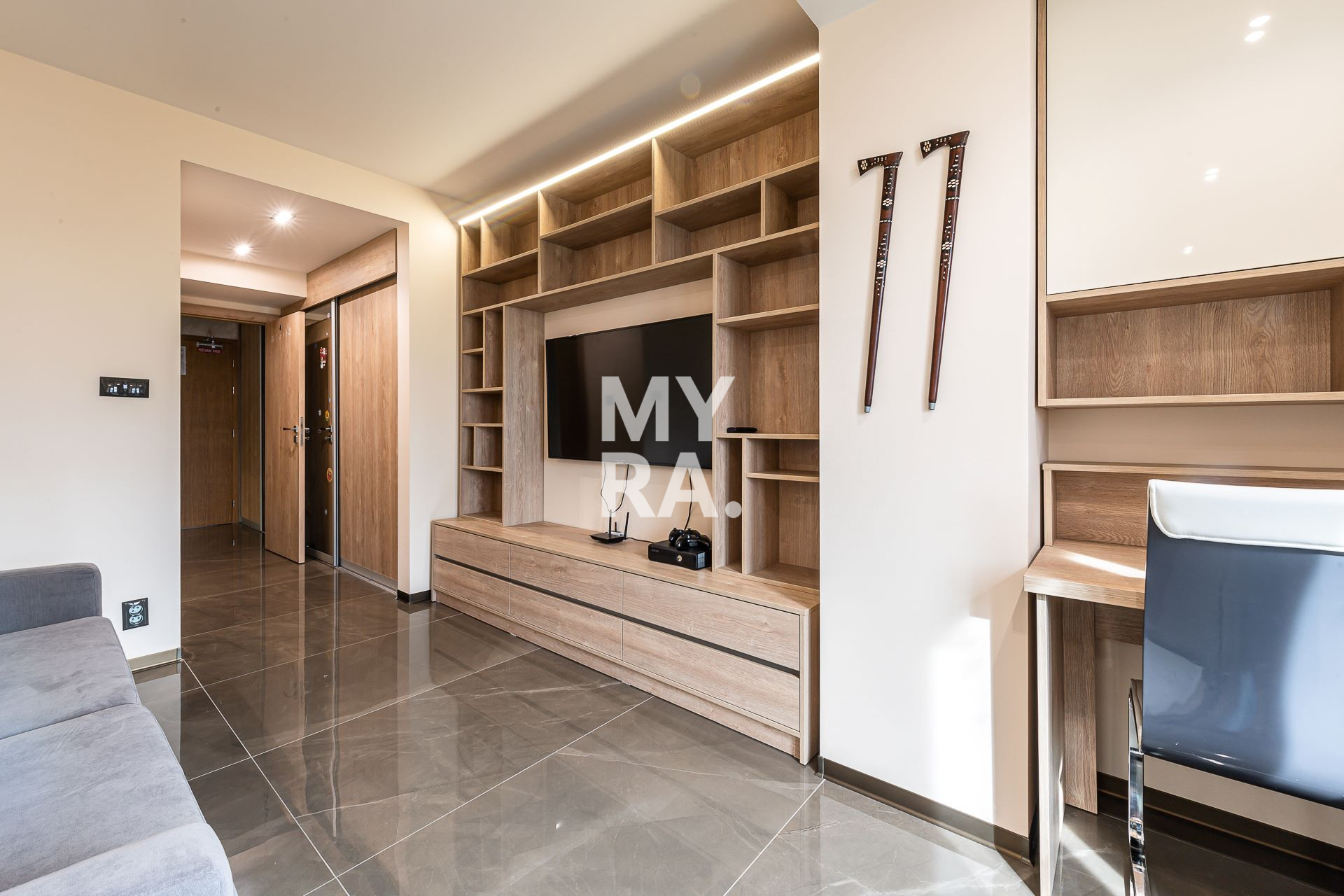 Pri vstupe do apartmánu Vás uvíta vstupná predsieň so šatníkom a odkladacím priestorom. Izba so samostatnou priestrannou kúpeľňou s toaletou a sprchovým kútom, v ktorej je 5 lôžok. Po elegantnom podsvietenom drevenom schodisku sa dostanete na poschodie Penthouse, kde Vás očarí veľkorysá obývacia miestnosť s jedinečnými panoramatickými výhľadmi na okolité končiare Vysokých Tatier.