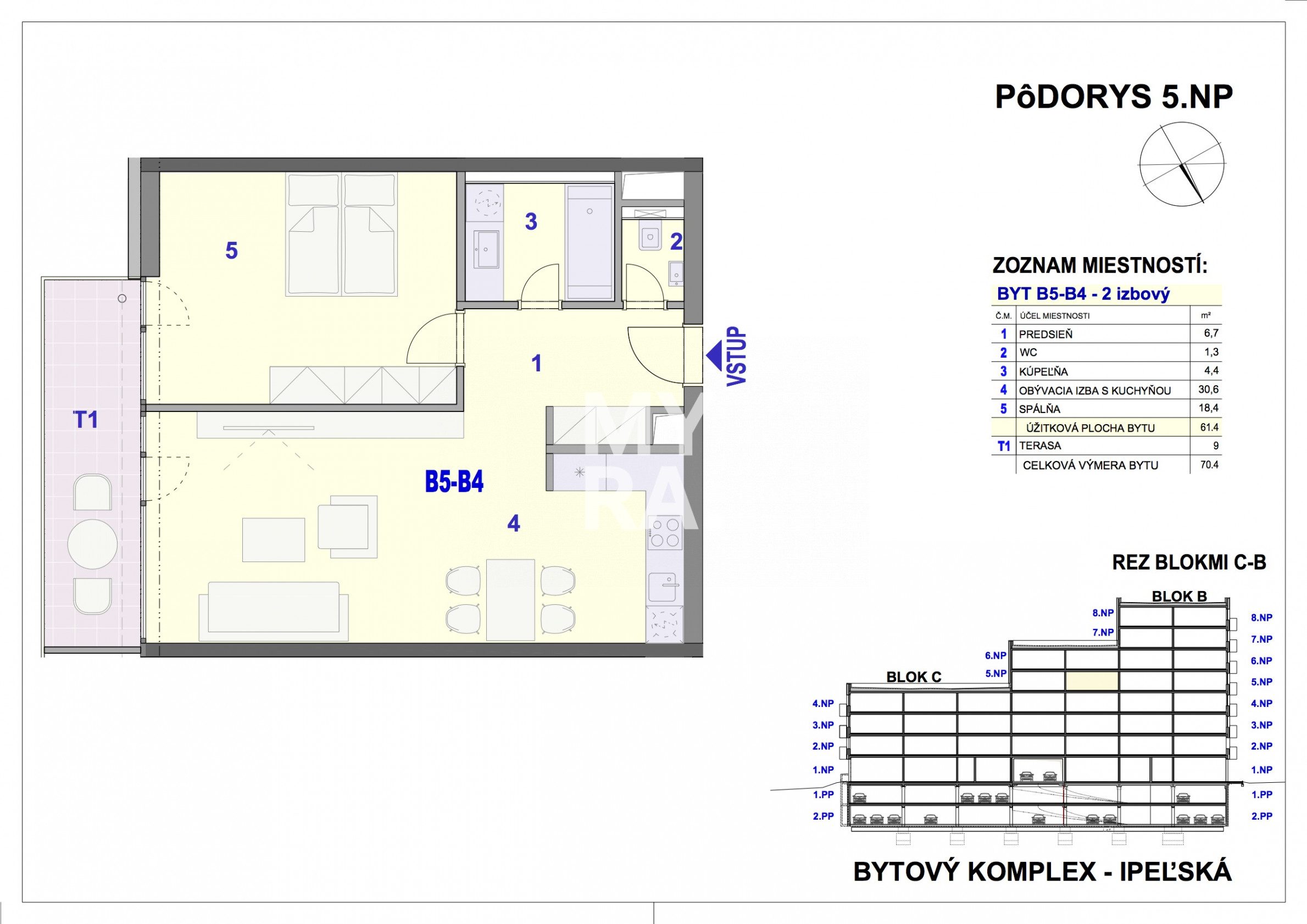 MYRA. Košice a realitný maklér Roman Magdolen Vám ponúkajú 2-izbový byt B5-B4 v pripravovanom Bytovom komplexe Ipeľská. Ide o holobyt na 5. NP o výmere 61,40 m2 s terasou o veľkosti 9 m2, ktorý je orientovaný na východ. Byt bude mať k dispozícii stropné kúrenie a predprípravu na stropné chladenie. Chladenie bude pre zákazníka pripravené vo forme rozvodov, koncovú jednotku si zákazník zabezpečuje samostatne. K vybaveniu holobytu budú patriť hliníkové rámy okien s izolačným trojsklom, vstupné trojbodové bezpečnostné a protipožiarne dvere, vnútorné jednovrstvové omietky s dvojnásobnou maľbou a elektroinštalácia. Možnosť zakúpenia parkovacieho miesta v podzemnom parkovisku a pivnice.