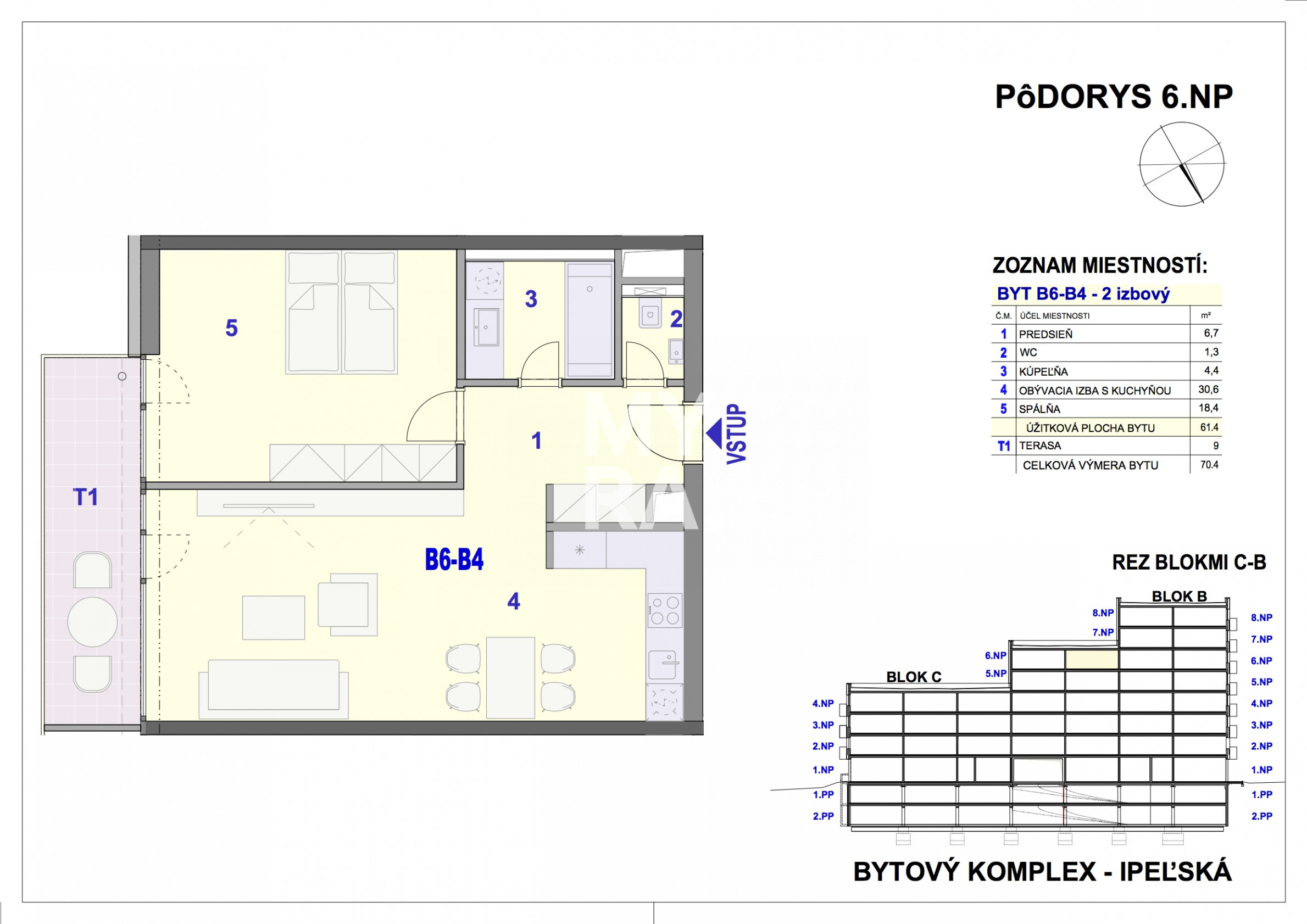 MYRA. Košice a realitný maklér Roman Magdolen Vám ponúkajú 2-izbový byt B6-B4 v pripravovanom Bytovom komplexe Ipeľská. Ide o holobyt na 6. NP o výmere 61,40 m2 s terasou o veľkosti 9 m2, ktorý je orientovaný na východ. Byt bude mať k dispozícii stropné kúrenie a predprípravu na stropné chladenie. Chladenie bude pre zákazníka pripravené vo forme rozvodov, koncovú jednotku si zákazník zabezpečuje samostatne. K vybaveniu holobytu budú patriť hliníkové rámy okien s izolačným trojsklom, vstupné trojbodové bezpečnostné a protipožiarne dvere, vnútorné jednovrstvové omietky s dvojnásobnou maľbou a elektroinštalácia. Možnosť zakúpenia parkovacieho miesta v podzemnom parkovisku a pivnice.
