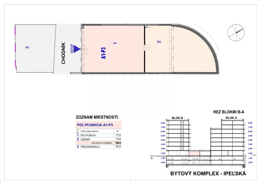 MYRA. Košice a Ing. Timošová Silvia Vám ponúka na predaj samostatný obchodný priestor A1P3 v pripravovanom Bytovom komplexe IPEĽSKÁ. Jedná sa o holopriestor nachádzajúci sa na 1. nadzemnom podlaží o celkovej výmere 150 m2. Priestor bude rozdelený na 2 samostatné miestnosti: polyfunkcia o výmere 77 m2 a zázemie o výmere 73 m2.