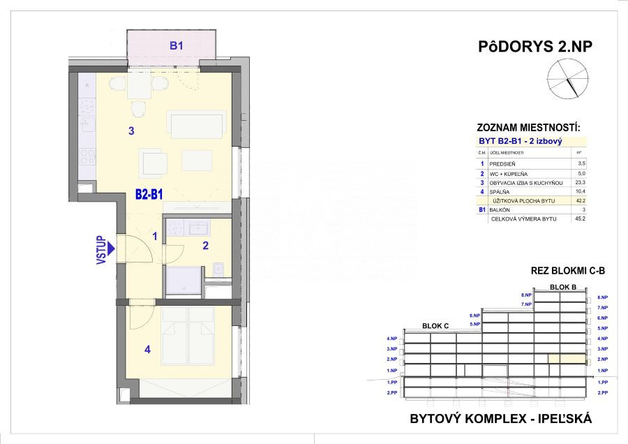 Holobyt o výmere 45,20 m2 je na prvom poschodí (2. NP). Byt má k dispozícii balkón o výmere 3 m2. Nájdete tu aj priestrannú kúpeľňu s toaletou.