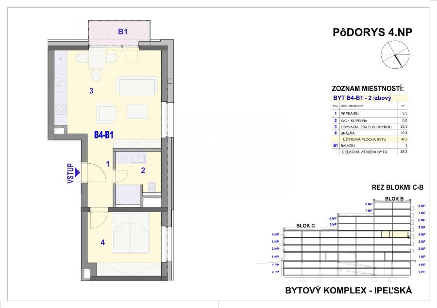 Holobyt o výmere 45,20 m2 je na treťom poschodí (4.NP). Z obývacej časti prepojenej s kuchyňou je výstup na balkón o výmere 3 m2. V spálni je priestor pre vstavanú skriňu. Kúpeľňa je spojená s toaletou.
