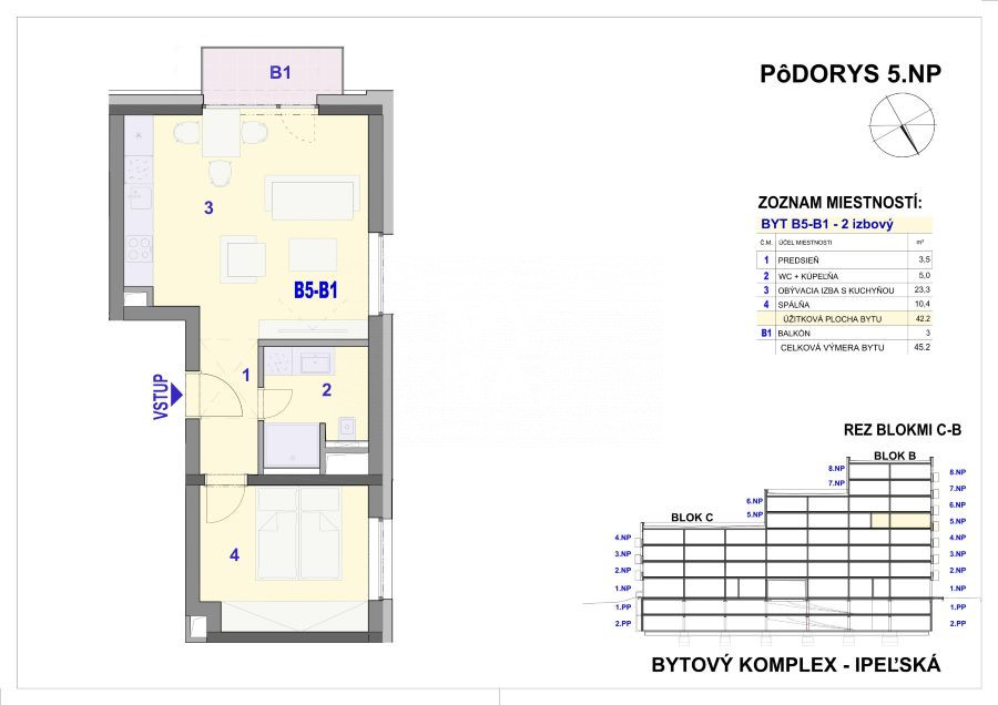 MYRA. Košice a Ing. Timošová Silvia Vám ponúka na predaj 2-izbový priestranný holobyt B5B1 v novostavbe IPEĽSKÁ na sídlisku Terasa v Košiciach pri Univerzitnej nemocnici L. Pasteura Košice. Bytový komplex IPEĽSKÁ ponúka v prvej etape 74 bytov s terasami a balkónmi, 118 parkovacích miest v podzemnej garáži a 71 pivníc. Projekt budú tvoriť dve samostatné budovy, ktoré budú mať 8 nadzemných podlaží a 2 podzemné podlažia vzájomne prepojené podzemným parkoviskom. Súčasťou Bytového komplexu IPEĽSKÁ je aj 5 obchodných, nebytových priestorov na prízemí (1.NP).