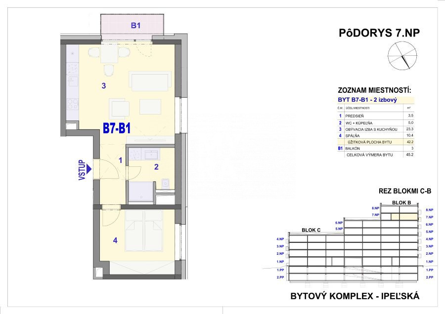 MYRA. Košice a Ing. Timošová Silvia Vám ponúka na predaj 2-izbový priestranný holobyt B7B1 v novostavbe IPEĽSKÁ na sídlisku Terasa v Košiciach pri Univerzitnej nemocnici L. Pasteura Košice. Bytový komplex IPEĽSKÁ ponúka v prvej etape 74 bytov s terasami a balkónmi, 118 parkovacích miest v podzemnej garáži a 71 pivníc. Projekt budú tvoriť dve samostatné budovy, ktoré budú mať 8 nadzemných podlaží a 2 podzemné podlažia vzájomne prepojené podzemným parkoviskom. Súčasťou Bytového komplexu IPEĽSKÁ je aj 5 obchodných, nebytových priestorov na prízemí (1.NP).