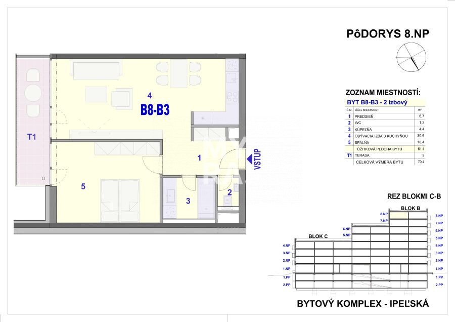 MYRA. Košice a Ing. Timošová Silvia Vám ponúka na predaj 2-izbový priestranný holobyt B8B3 v novostavbe IPEĽSKÁ na sídlisku Terasa v Košiciach pri Univerzitnej nemocnici L. Pasteura Košice. Bytový komplex IPEĽSKÁ ponúka v prvej etape 74 bytov s terasami a balkónmi, 118 parkovacích miest v podzemnej garáži a 71 pivníc. Projekt budú tvoriť dve samostatné budovy, ktoré budú mať 8 nadzemných podlaží a 2 podzemné podlažia vzájomne prepojené podzemným parkoviskom. Súčasťou Bytového komplexu IPEĽSKÁ je aj 5 obchodných, nebytových priestorov na prízemí (1.NP).