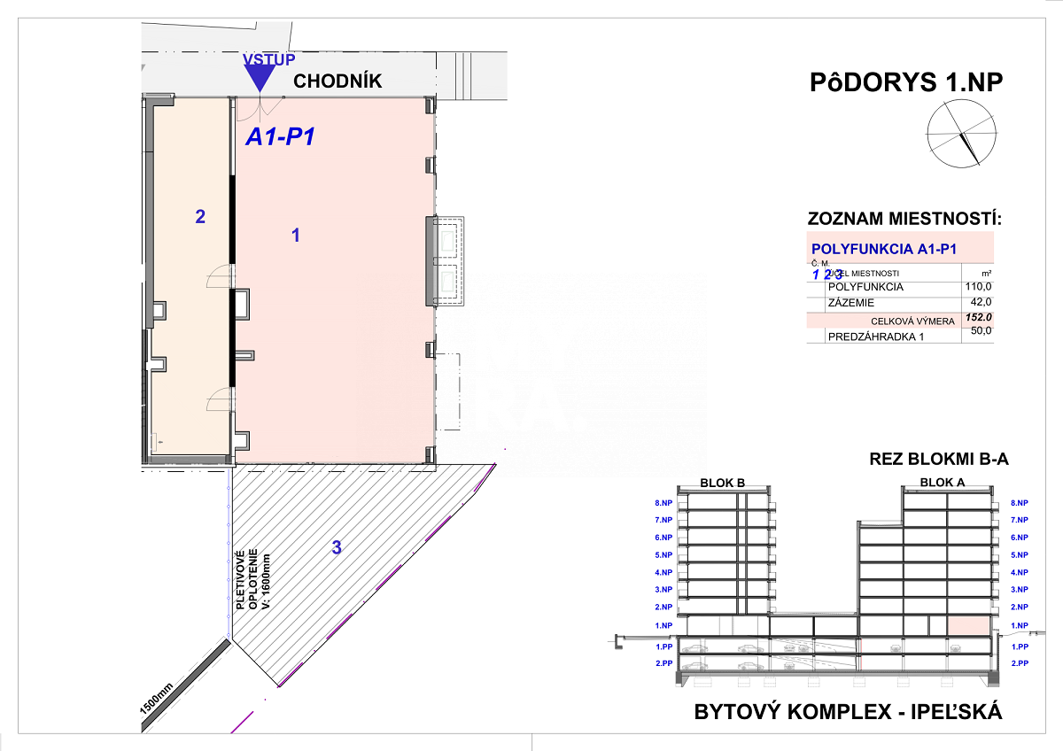 Nebytový priestor o výmere 152 m2 je na prízemí s priamym vstupom z chodníka. Priestor je na rohu bytového domu orientovaný na juh smerom na Ipeľskú ulicu, na západ a na sever. Steny orientované na chodník okolo budovy budú presklenné. V pôdoryse je znázornená aj časť priestoru, ktorá bude predelená priečkou a bude tvoriť budúce zázemie priestoru. Budúci vlastník si môže naprojektovať priestor na mieru.
