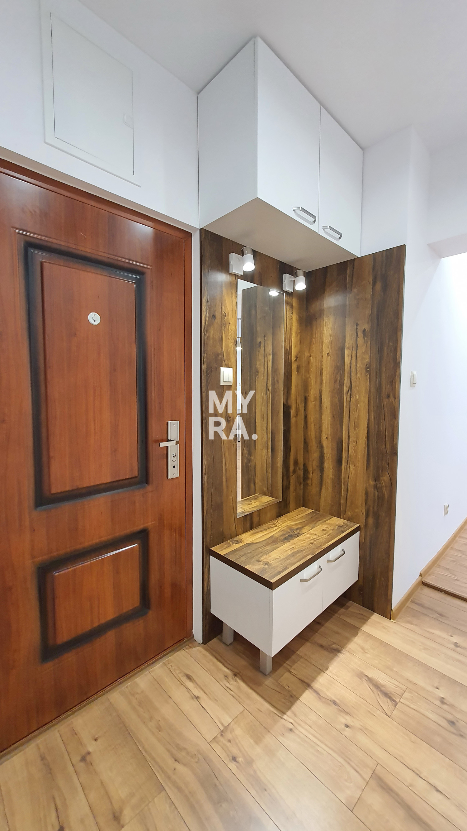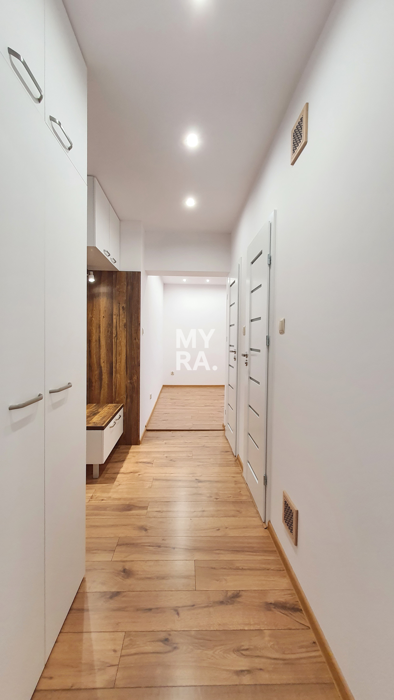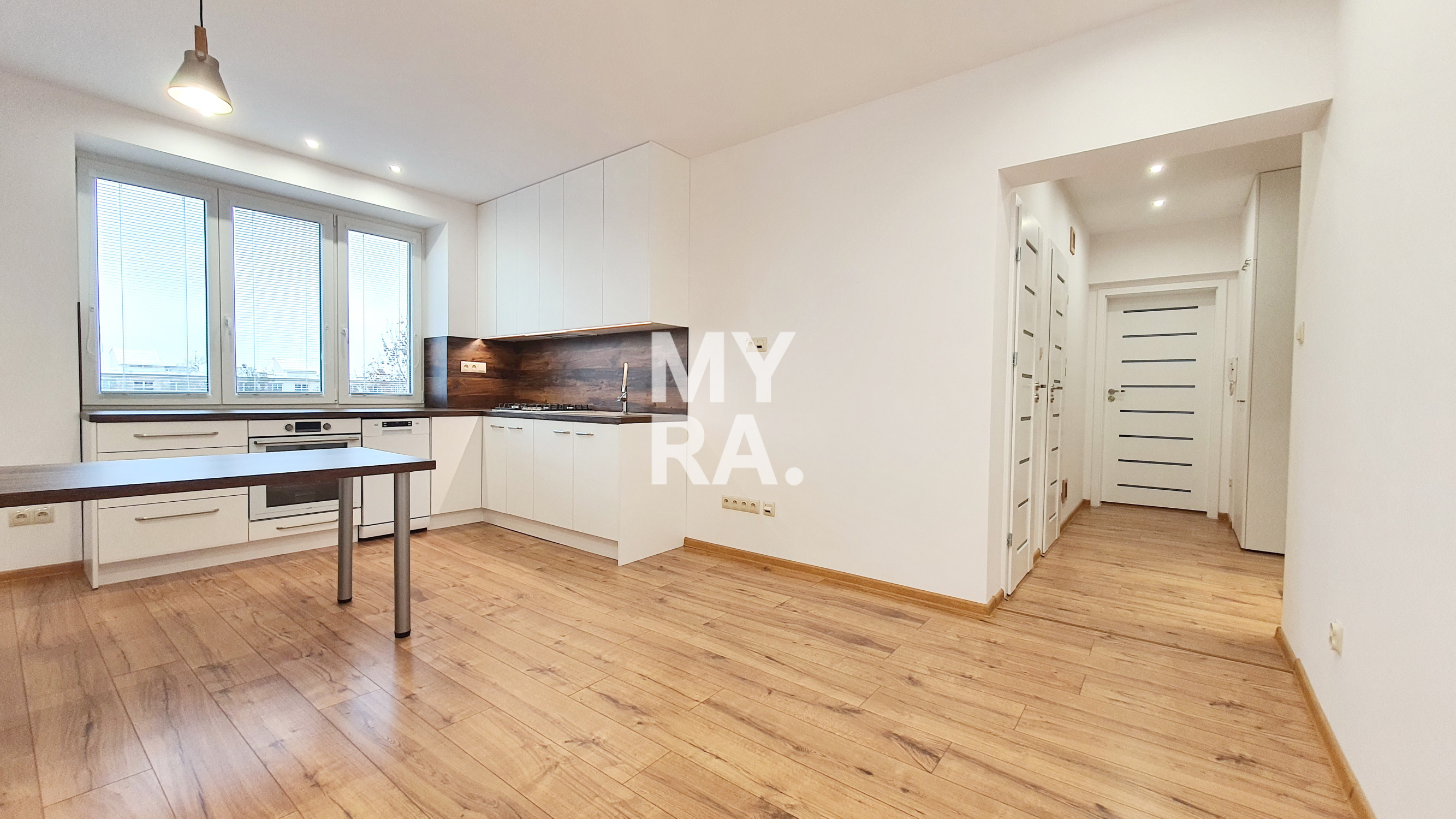 DISPOZÍCIA BYTU: Vstup do bytu chránia bezpečnostné dvere. Chodba je svetlá, vkusná a tvorí funkčné prepojenie celého bytu. Nachádza sa tam vstavaná skriňa na mieru. Oproti vchodovým dverám je samostatná kúpeľňa s vaňou, umývadlom a skrinkou so zrkadlom. Hneď vedľa sa nachádza samostatná toaleta. Po ľavej strane od vchodových dverí sa nachádza obývačka spojená s kuchyňou. Kuchynská linka obsahuje drez s batériou, plynová varná doska, digestor, umývačku riadu a elektrickú rúru. Taktiež množstvo úložného priestoru. Priestor určený pre jedálenský stôl so stoličkami (súčasť vybavenia kuchyne) dotvára útulnú atmosféru obývacieho srdca domova. Po pravej strane od vchodových dverí je vstup do prvej izby, cez ktorú sa dostanete do druhej nepriechodnej izby.