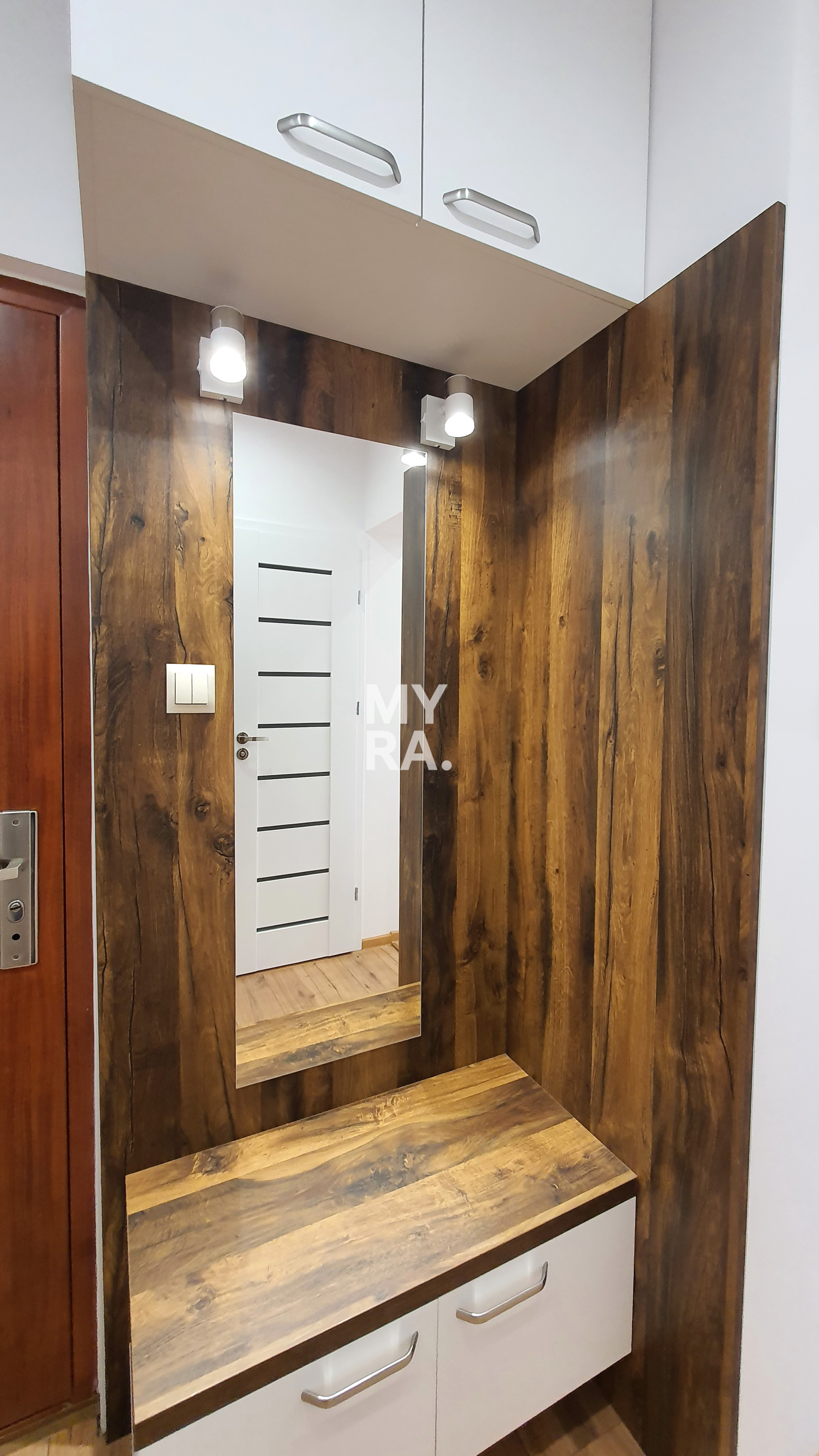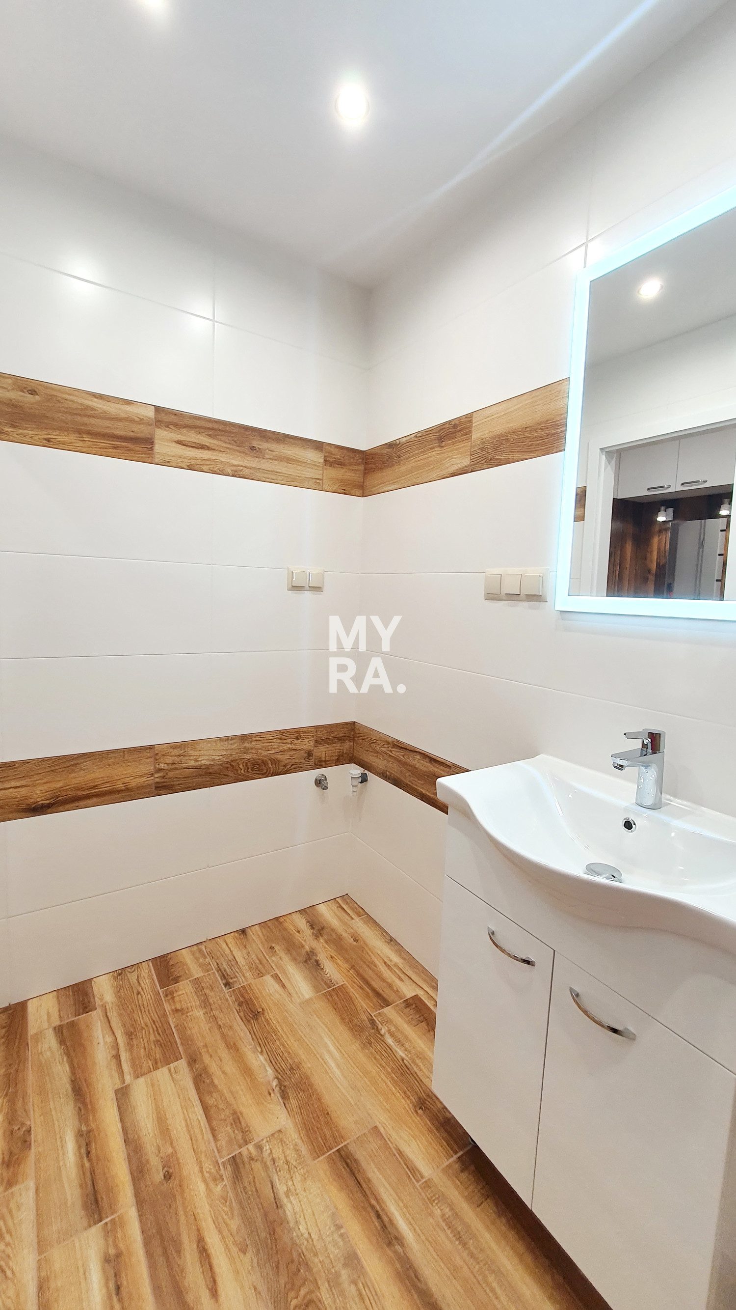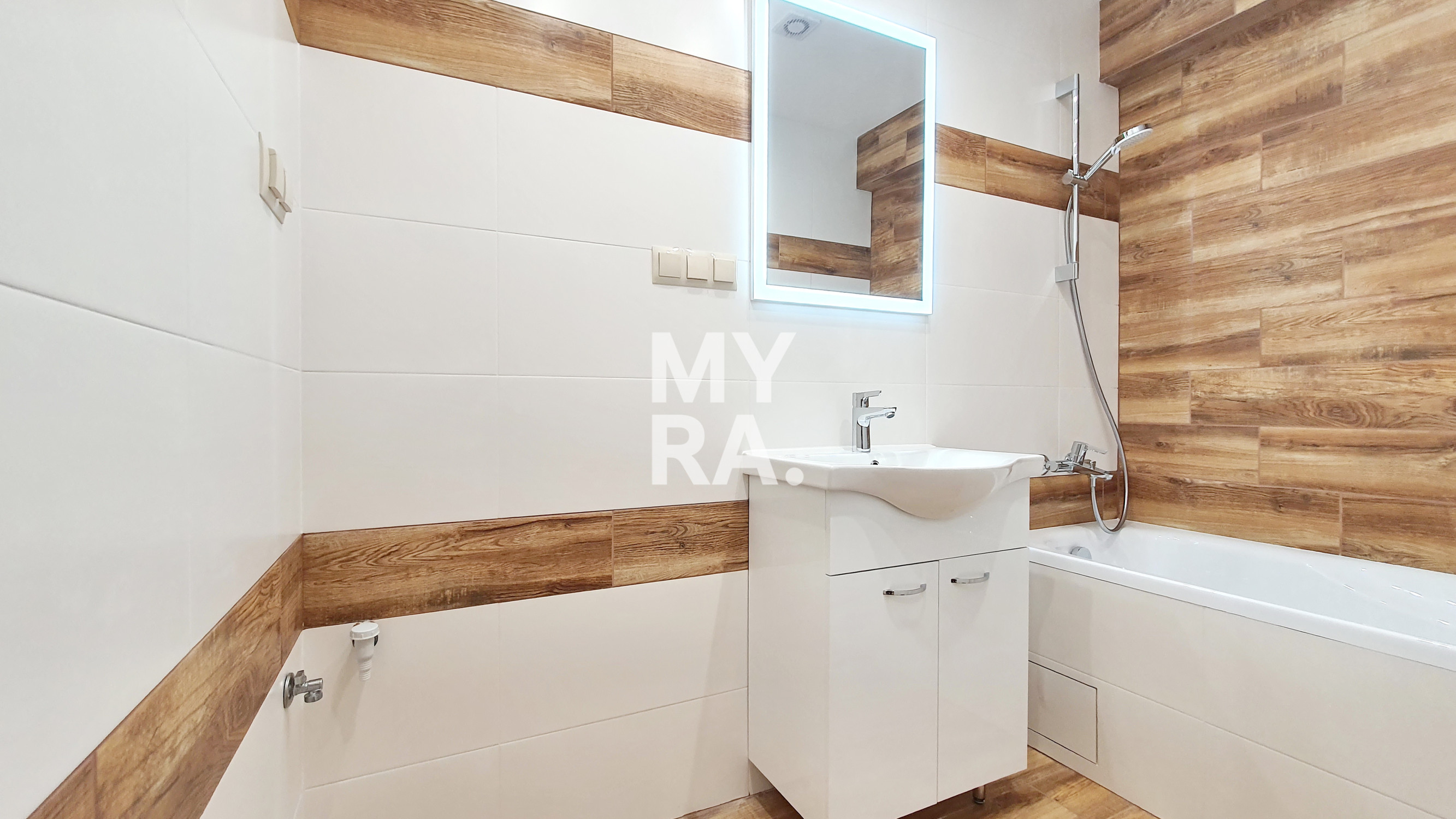 DISPOZÍCIA BYTU: Vstup do bytu chránia bezpečnostné dvere. Chodba je svetlá, vkusná a tvorí funkčné prepojenie celého bytu. Nachádza sa tam vstavaná skriňa na mieru. Oproti vchodovým dverám je samostatná kúpeľňa s vaňou, umývadlom a skrinkou so zrkadlom. Hneď vedľa sa nachádza samostatná toaleta. Po ľavej strane od vchodových dverí sa nachádza obývačka spojená s kuchyňou. Kuchynská linka obsahuje drez s batériou, plynová varná doska, digestor, umývačku riadu a elektrickú rúru. Taktiež množstvo úložného priestoru. Priestor určený pre jedálenský stôl so stoličkami (súčasť vybavenia kuchyne) dotvára útulnú atmosféru obývacieho srdca domova. Po pravej strane od vchodových dverí je vstup do prvej izby, cez ktorú sa dostanete do druhej nepriechodnej izby.